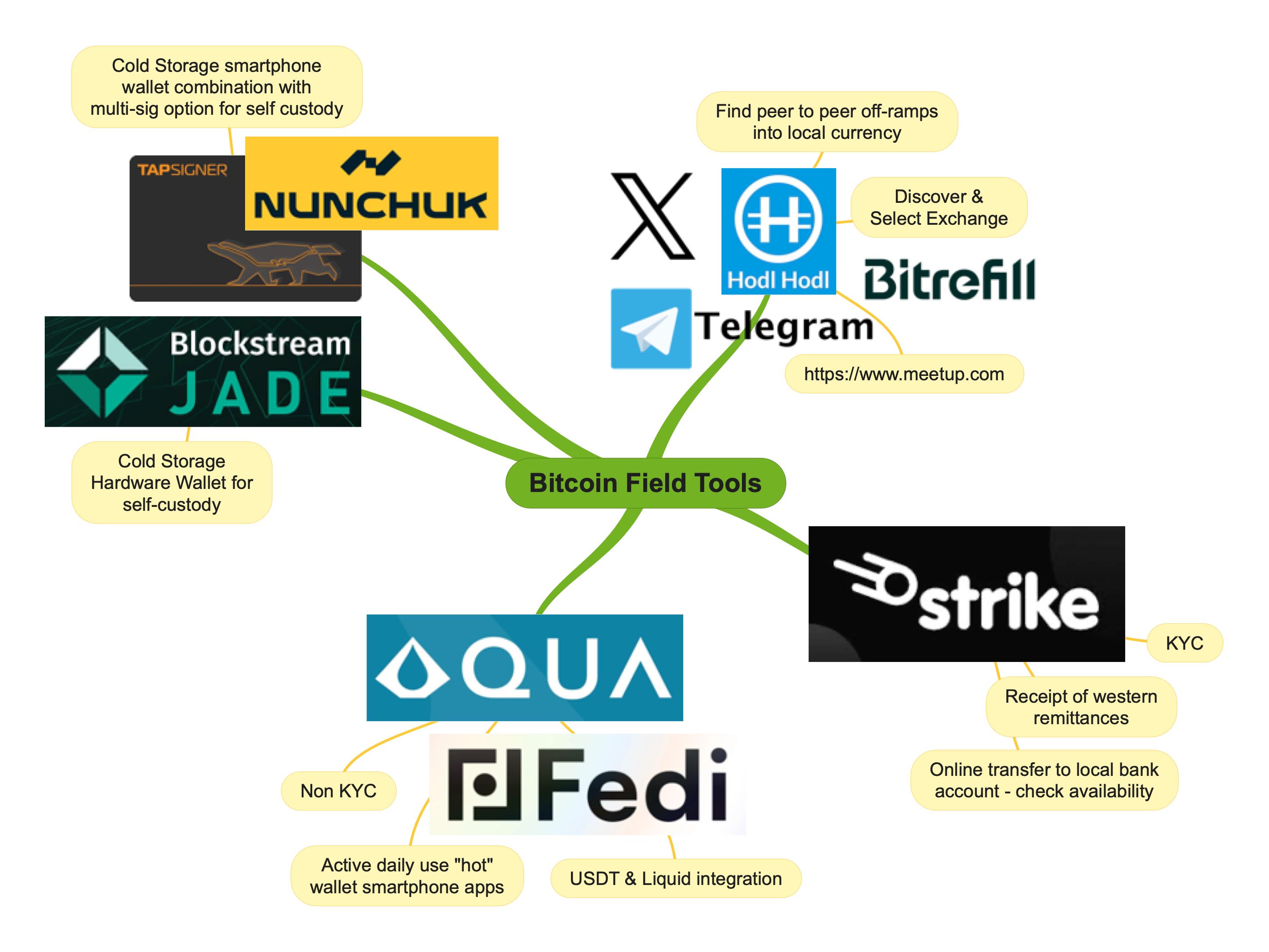 We identified 4 areas of classification that are most important for field workers to learn when preparing to use Bitcoin: Cold storage hardware wallets, smartphone lightning wallets, Remittance receiving tools, and local Bitcoin buying/selling strategies (see the next graphic diagram). We tried to pick the best one or two options of each, including our reasoning for those choices, though it should be understood that we are not financial advisors and each person should do their own research and carefully choose the best options for their needs. Cold Storage Hardware Wallets The Blockstream Jade device (https://help.blockstream.com/hc/en-us/categories/900000061906-Blockstream-Jade) is a cold storage hardware wallet for self-custody of on-chain Bitcoin. It is among the cheaper of the choices at approximately $65 USD, but we have not learned how accessible it is for shipping to African countries. Devices like this connect to a laptop or desktop computer to safely verify the user’s seed phrase when making a transaction. Alternatively, and perhaps more appropriate for the global south context, we recommend the Tap Signer card (https://tapsigner.com) for use in conjunction with the Nunchuk app (https://nunchuk.io) on a smartphone with an NFC sensor. The card is used to safely verify the user’s seed phrase when making a transaction by coming in contact with the back of the phone. In addition, Nunchuk provides the option of sharing access to one wallet by many parties for greater security by requiring multiple signatures to make transactions (multi-sig). Africans are familiar with this type of accountable community savings group called a Chama that often uses a cash box with multiple locks on it to secure community funds. The transfer fees for sending Bitcoin is variable and goes up as demand for sending transactions increases. Recently it has been anywhere between $.50 and $30 USD. Consequently, we recommend using a cold storage wallet like this only for long term savings of amounts of perhaps $1,000 USD or more. It’s quite important to have a working understanding of how Bitcoin’s layers function and when to apply the use of each one. Smartphone Lightning Wallets Lightning is the name for one of Bitcoin’s layer 2 protocols. The benefits of using Lightning include faster transaction time and much lower fees. Buying a cup of coffee and making other everyday local exchanges is far more efficient using the lightning network. We thought Aqua (https://aquawallet.io) might be the most advisable option for its versatility in transferring value between its three forms (on-chain, Lightning, and Liquid). Aqua operates on something called a “side-chain” that functions using Bitcoin, but through a sufficiently centralized federation of 15 Bitcoin-focused guardian organizations. Though it gives up much of the decentralized protection, it provides global access and non-custodial ownership of your assets (the user is responsible for storing the seed phrase securely). It also allows interaction with USDT, which is a stablecoin that is commonly used in exchanges or to convert to other local currencies. Fedi (https://www.fedi.xyz) is another federated community software that is being developed to provide private communities of various sizes (from family to city) with their own banking and messaging platform. This option would require a group of trusted leaders to operate and a degree of technical assistance to set up. Featured Remittance Tool Strike (https://strike.me) is a smartphone app with unique features that allow users in a growing number of countries (https://strike.me/faq/where-is-strike-available-wr/) to connect the app to their bank accounts and send money directly to other global users instantly and with almost no fees. Strike accomplishes this by utilizing the global decentralized qualities of Bitcoin and the convenience of the lightning network to flash- convert the funds while in transit and back into the currency of choice for the recipient to deposit into their own bank account. The process bypasses the SWIFT system and other intermediaries like Western Union entirely. Strike requires “Know Your Customer” (KYC) compliance, which means there is an identity verification process when you open your account. Not only does Strike offer cross- border funds transfer, it also offers an easy way for users to buy or sell their Bitcoin through a connected bank account. Local Bitcoin Buying and Selling Strategies The number of reliable Bitcoin exchanges is hard to pin down. Traders often need to be scrappy about where they find others who would like to buy or sell Bitcoin on a peer to peer level. There is no active listing of global buyers and sellers. A centralized list would be difficult to keep up-to-date and carries security concerns when operating in certain jurisdictions. We’ve opted instead to give some pointers for how individuals can discover creative local options while being “shrewd as serpents and innocent as doves.” Both Telegram and the platform formerly known as Twitter are great places to look for people with whom you can set up a face-to- face meeting. In many countries, the local money changer may exchange Bitcoin in addition to various fiat currencies. In a recent training webinar, Human Rights Foundation Bitcoin Development Lead, Alex Li, suggested, “Tell the local watermelon seller that you’d like to buy from him, but all you have is Bitcoin. Perhaps he can direct you to someone who can help. He wants to sell to you after all.” A Bitcoin Core Developer who joined us in El Salvador shared the story of his year-long trip traveling the world with his family. He visited over 40 countries and in every country he found people who wanted to buy his Bitcoin in exchange for their local currency. There are also some online services which help facilitate peer-to-peer transactions depending on a person’s jurisdiction. Hodl Hodl (https://hodlhodl.com) is an escrow servi